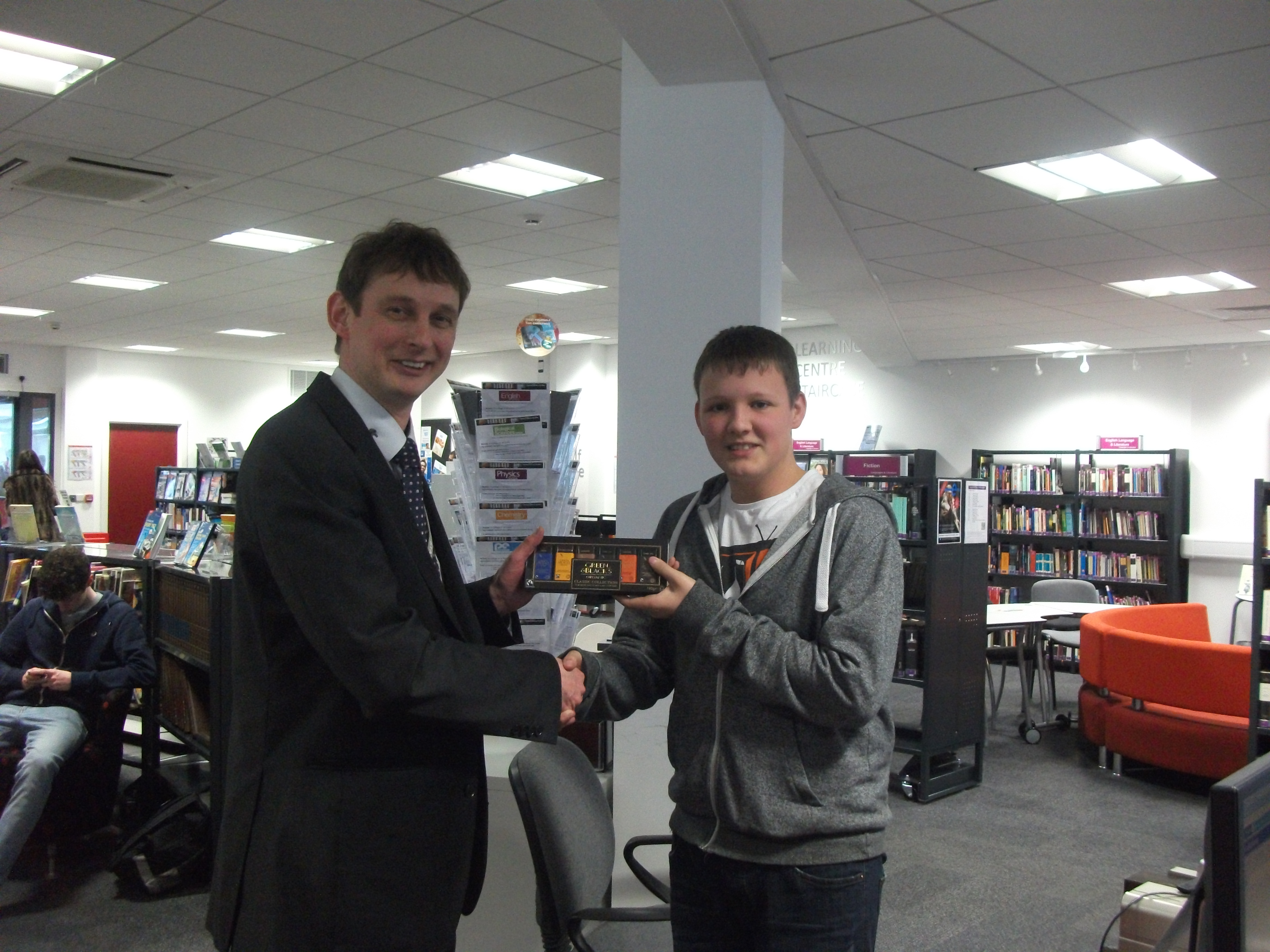 Fairtrade Competition – we have a winner! Posted on March 11, 2013October 29, 2013 by aquinaslc The winner of our Fairtrade competition was drawn on Friday afternoon. Here’s a picture of our Library Manager Jim Temple presenting the prize to the winning student. Congratulations!